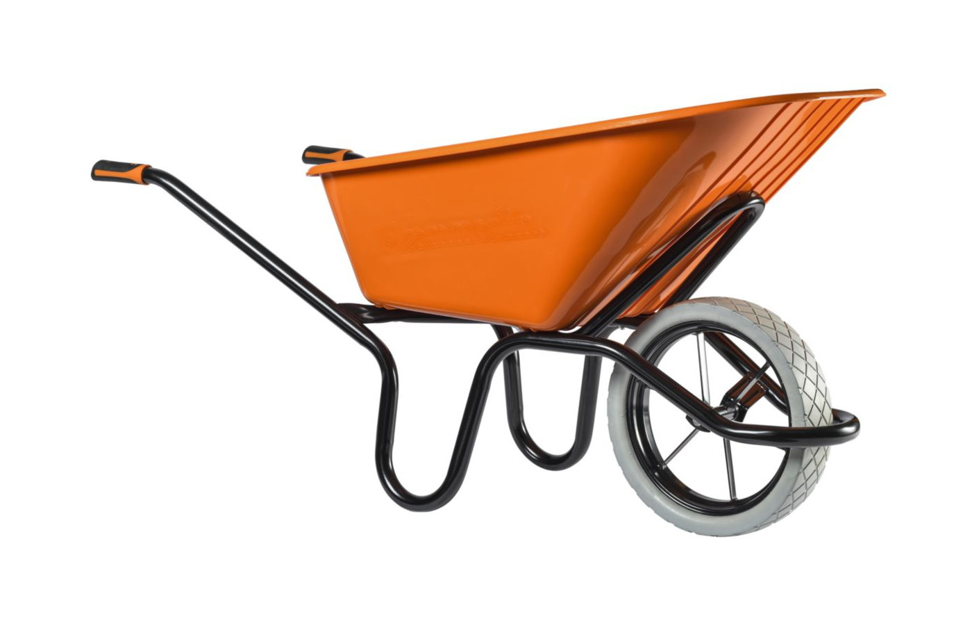 Brouette avec roue increvable Crusader Bati plus Réno Haemmerlin. Utilisation : travaux lourds du BTP. Caisse composite nervurée. Châssis Alpha renforcé par un support soudé. Poignées bi-matières. Roues increvables Ø 400 mm, jantes métal à rayons, Racing PF 69.