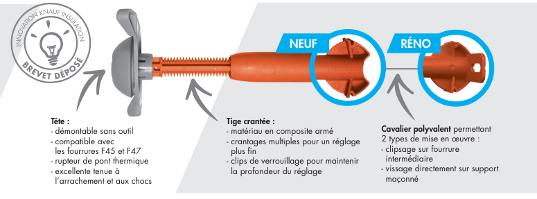 Appui intermédiaire Acoustizap 2 Néo Réno Knauf. Tête démontable, réglage fin. Pour contre-cloison sur ossature métallique. Rupteur de pont thermique et acoustique. Boite de 50 pièces.