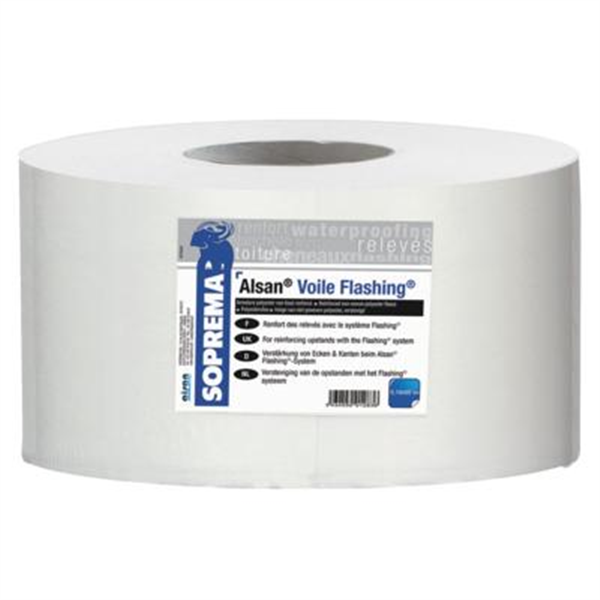 ALSAN VOILE FLASHING est une armature souple, élastique et facile à mettre en oeuvre. ALSAN® Voile FLASHING est collé dans l'angle avec la résine FLASHING. Nous conseillons une application en bande de 5 ml maximum de façon à permettre un positionnement aisé du voile sur une couche suffisamment fraîche. Marque: Soprema