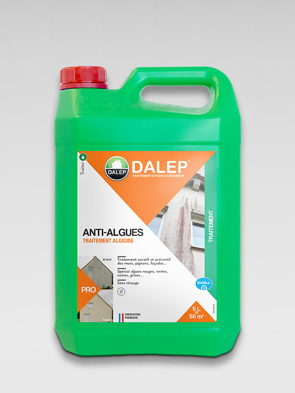 Anti-algues. Traitement algicide concentré de la marque Dalep. Traitement contre les algues rouges, grises… | Murs, pignons, façades… | Curatif et préventif | Agit seul | Concentré à diluer: 1L + 4L D’EAU = 10 M² .