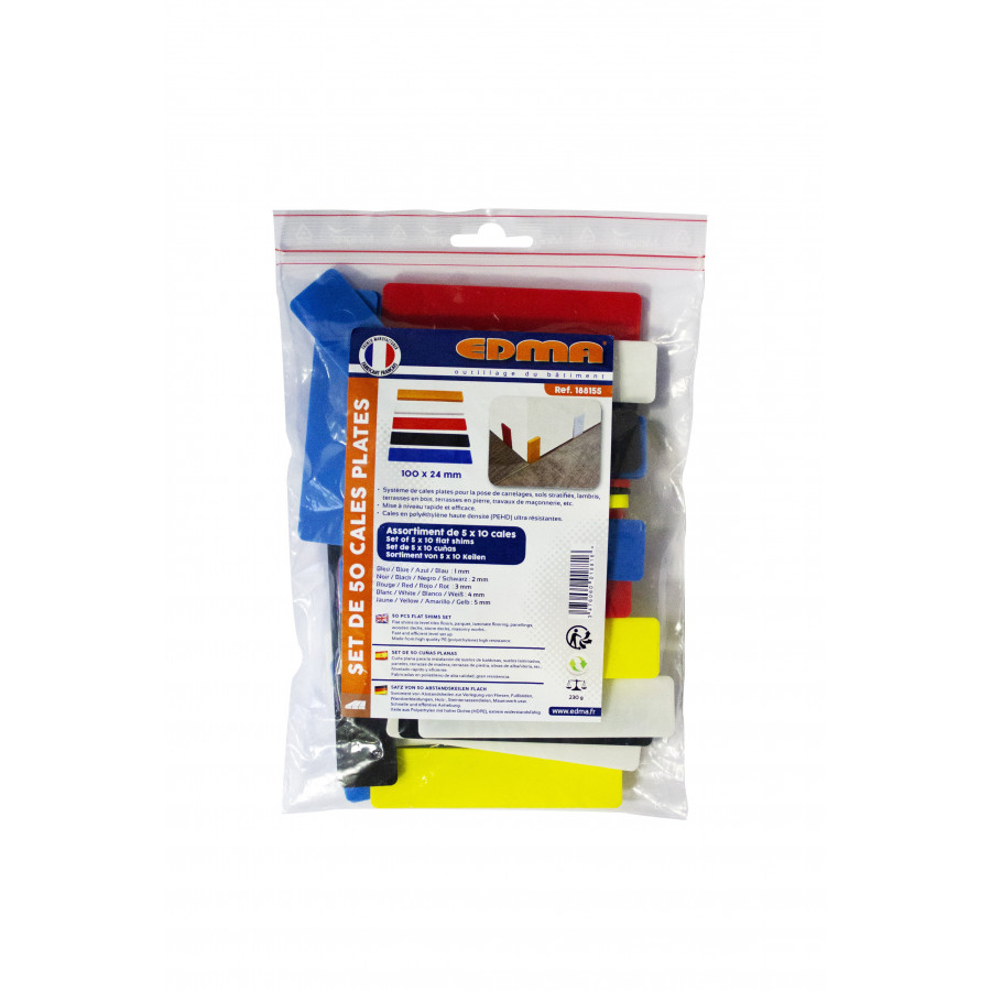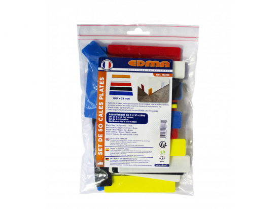 Assortiment de 50 cales plates pour la pose de revêtement sol Edma. 10 cales de chaque épaisseur : 1, 2, 3, 4 et 5 mm. Pour la pose de carrelages, sols stratifiés, lambris, terrasses en bois, terrasses en pierre, travaux de maçonnerie, etc. Mise à niveau rapide et efficace. Cales en polyéthylène. En sachet.
