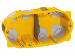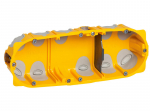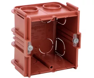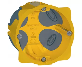Legrand. Boîte Ecobatibox 4 postes ou 8 modules, 10 modules profondeur 40mm - Diamètre de perçage 67mm - Pour montage d'appareillage à vis Entraxe de perçage 71mm - Livrée avec 1 cloison de séparation amovible pour accueil des fonctions étendues (exemple : prises pré-câblées) - Utilisation horizontale ou verticale Economie optimale en associant les obturateurs aux boîtes Ecobatibox Particulièrement adaptée aux maisons basse consommation (BBC) et maisons passives dans le cadre de la nouvelle réglementation thermique - Conforme à la norme NF-EN 60670-1 Volume de câblage optimum - Double entrée de câbles : - 1 pour câbles flexibles (Ø4mm à Ø9mm) - 1 pour gaine