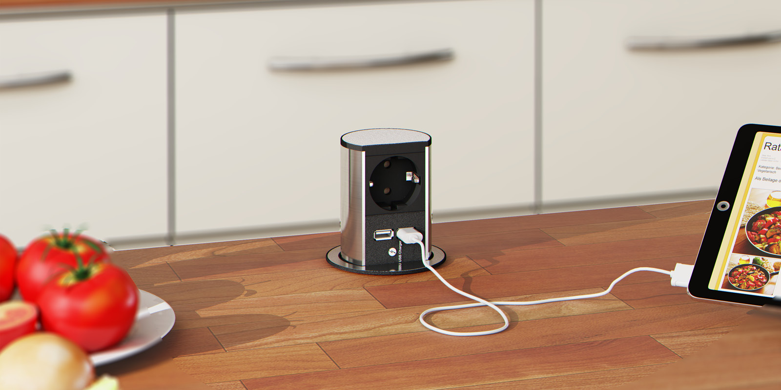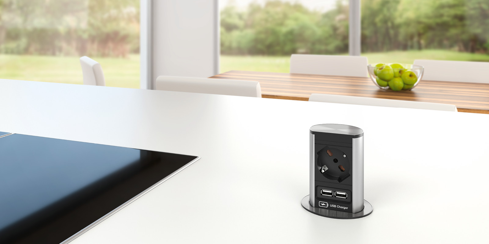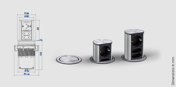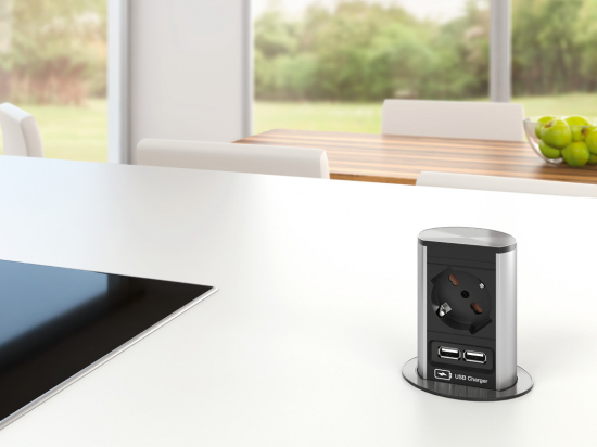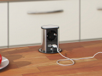 Bloc multiprises elevator pour table. ELEVATOR s’adapte de façon optimale à tous les environnements. De 79 mm de diamètre seulement, ELEVATOR est parfait pour l’intégration de raccordements électriques et de données dans les espaces les plus étroits. ELEVATOR se déploie et s’abaisse d’une simple pression du doigt. Son intégration est des plus simples. ELEVATOR s’introduit dans une découpe de 79 mm de diamètre et se fixe au meuble à l’aide d’une contre-bague. Cordon de 2 m
