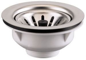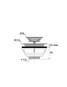 Bonde à panier pour évier à clapet coulissant. Marque Valentin. Bonde à panier sans trop plein pour évier à orifice de diamètre 90 mm. Cuvette inox diamètre 114 mm, serrage 0 à 12 mm, hauteur sous évier 55 mm | Vis et corps en plastique, panier en inox diamètre 76 mm | Débit 38l/mn