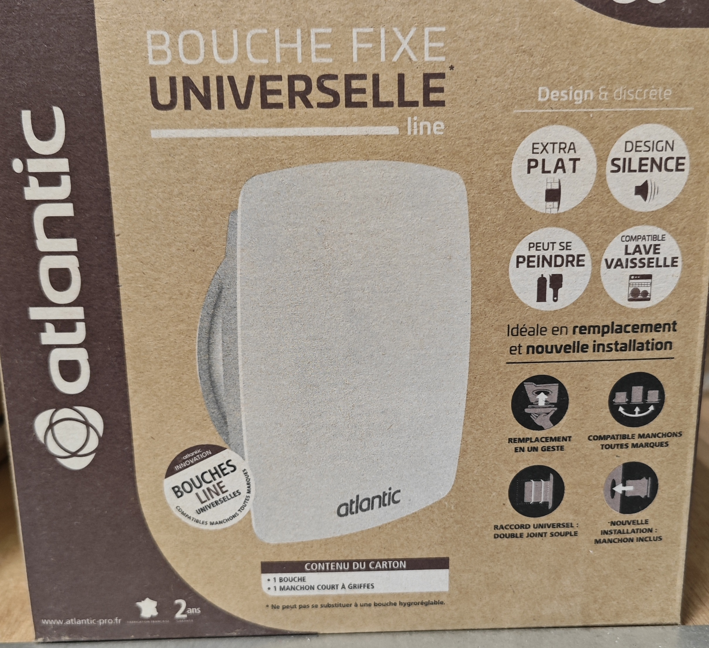 Bouche fixe universelle d'extraction et d'insufflation de marque Atlantic. Compatible avec toutes les marques de manchon grâce à son raccord universel. Entretien failité, ne s'encrasse pas, se démonte facilement et passe au lave-vaisselle. 2 modèles disponibles en 80 et 125.