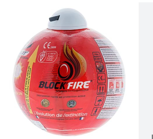 Boule extinctrice Block'Fire, intérieur / extérieur. Automatique et Autonome. Protection incendie. Poudre sèche. Fabrication française.Non rechargeable. Garantie 5 ans. Kit fixation murale inclus. Capacité d'extinction: 8m². Déclenchement au contact des flammes du feu automatiquement. Voir la vidéo ICI