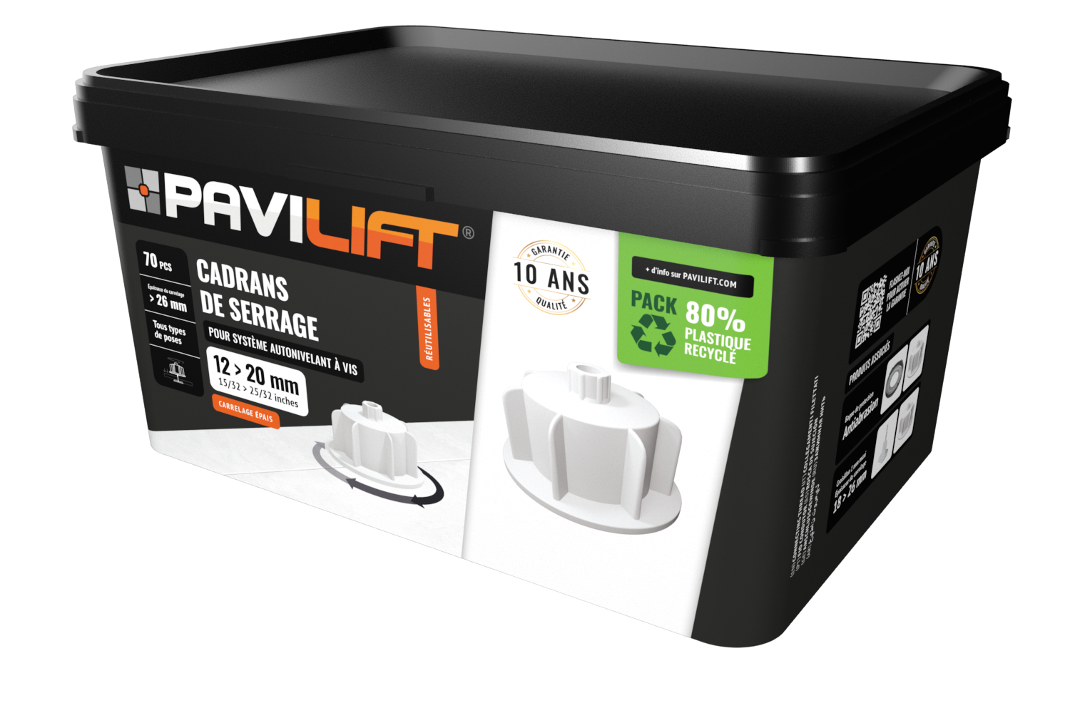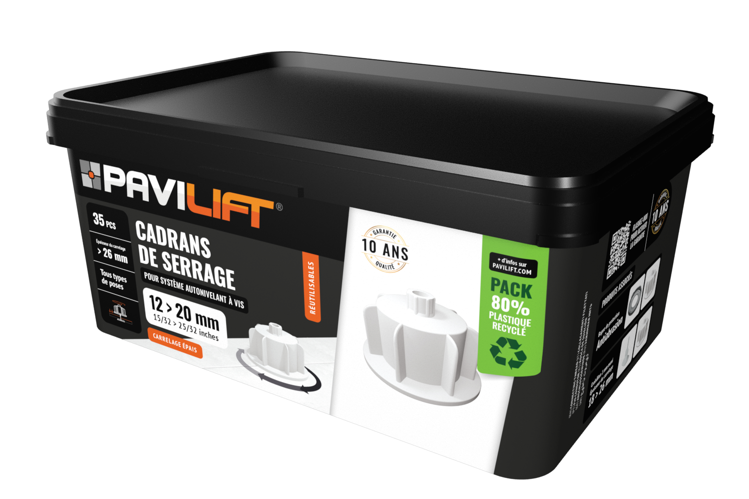 Les cadrans rotatifs noirs pour épaisseur de carreaux de 3 à 12 mm, pour tous types de poses, s'associent aux croisillons Pavilift, jaunes, verts, bleus ou blancs selon l'épaisseur de vos joints.