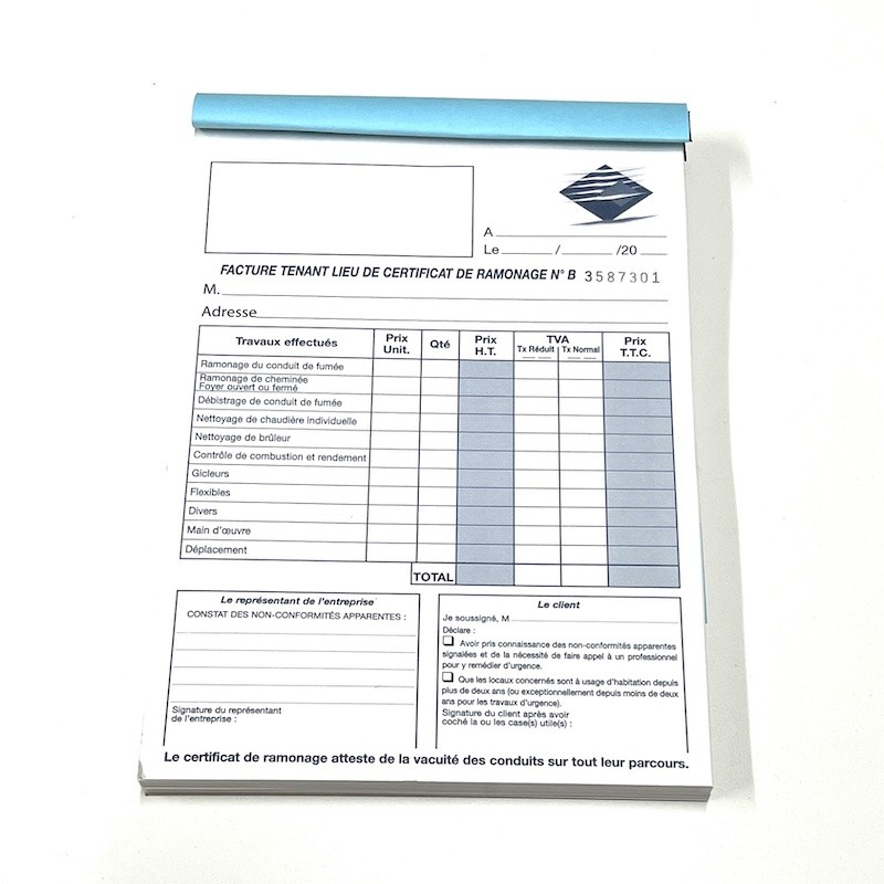 50 feuilles autocopiantes en triple exemplaires, pour: - établir une facture de suite après votre intervention - laisser à votre client un certificat de ramonage - conserver une souche pour votre comptabilité