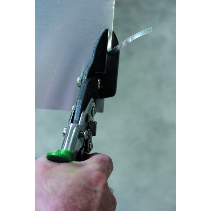 Cisaille coupe articulée "Passe-Franc" à lames décalées. Coupe à droite. Capacités de coupe : 0,9 mm : inox. 1 mm : tôle bleuie. 1,2 mm : galva, zinc. 1,5 mm : cuivre, laiton, tôle douce. 2 mm : PVC, aluminium. 2,5 mm : polycarbonate. Coupe de 35 mm en une seule pression. Double garde protégeant le doigt de l'utilisateur.