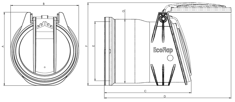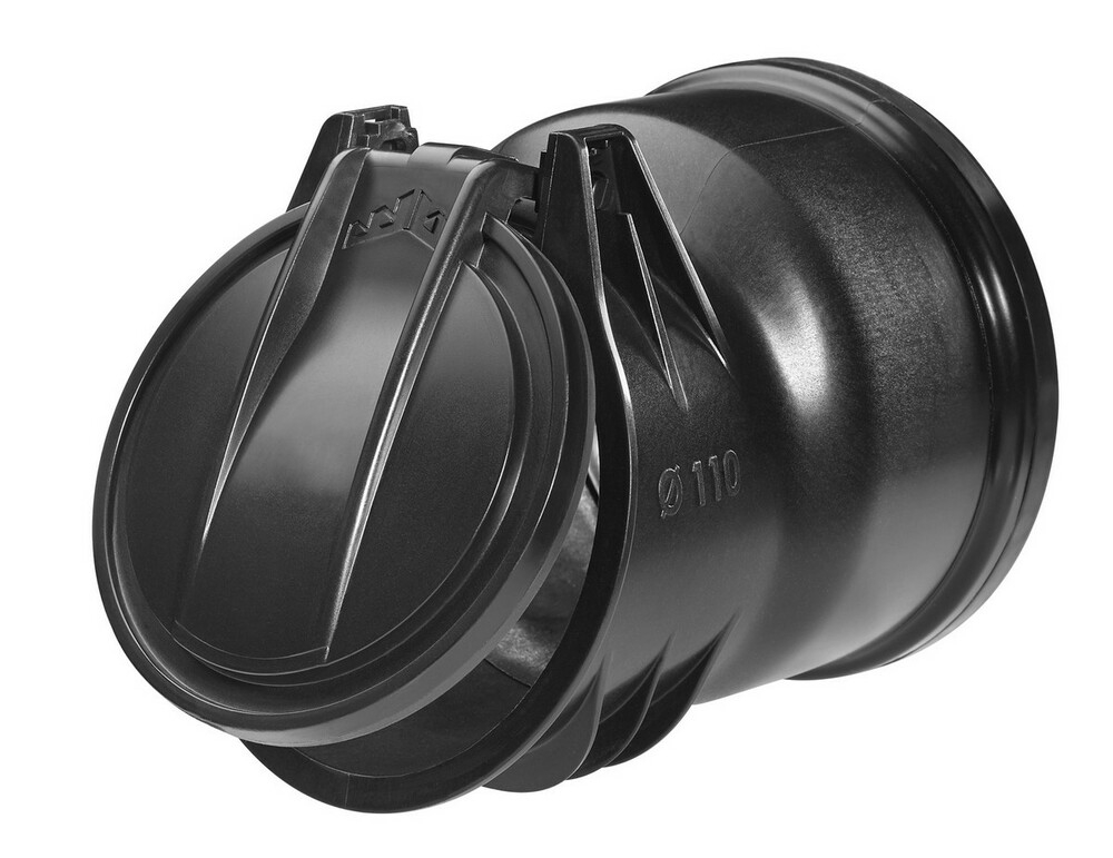 Disponible en DN 100, 110, 125, 160 et 200, le clapet est composé :d'un corps en polyamide renforcé à 20% de fibres de verre (PA6-20FCV) recyclable ; d'un battant en PPH renforcé à 30% de billes de verre recyclable : d'un joint à lèvre en TPE surmoulé au niveau du battant pour garantir une étanchéité optimale; d'un joint à emboîtement en TPE surmoulé.