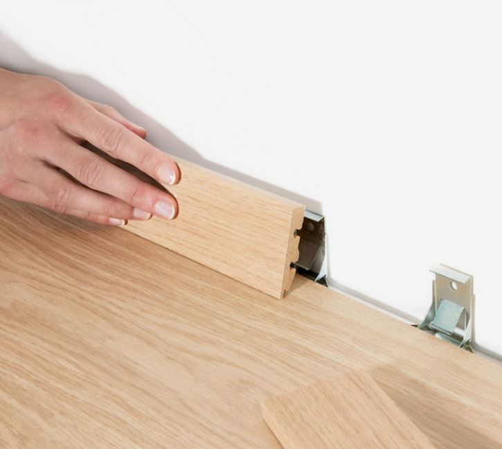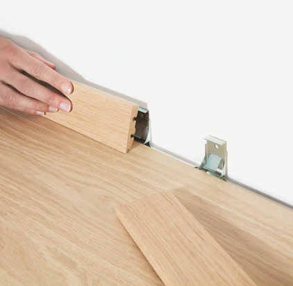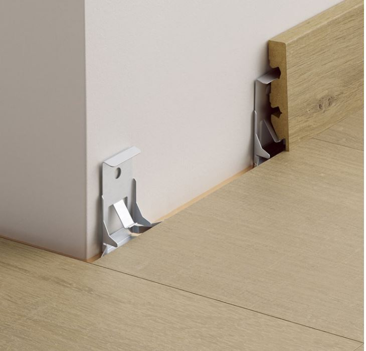 Ces clips maintiennent fermement les plinthes standards en place sans avoir besoin de vis ou de colle. Vous devez poser les clips en même temps que votre sol. Il vous suffit d'installer un clip tous les 40 cm le long du mur, puis d'encliqueter la plinthe pour la mettre en place.