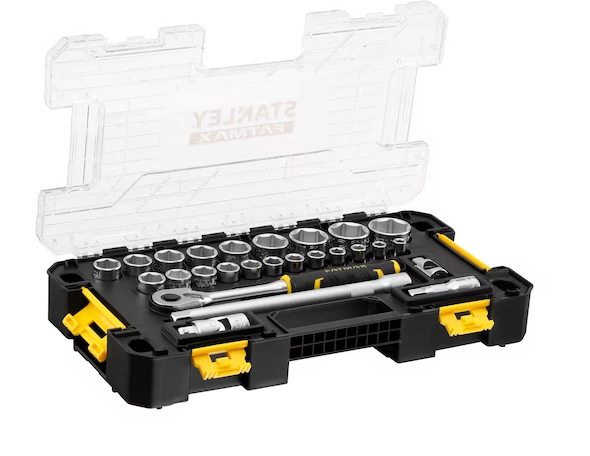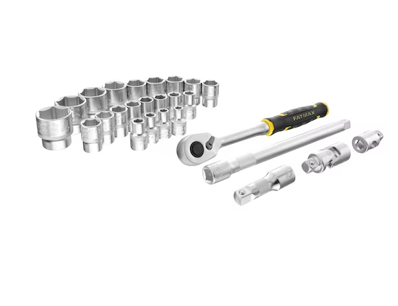 Coffret comprenant: 1 Cliquet 120 dents 1/2’’ FATMAX-21 Douilles 1/2” (6 pans) : 8 – 9 – 10 – 11 – 12 – 13 – 14 –15 – 16 – 17 – 18 – 19 – 20 – 21 – 22 – 23 – 24 – 27 – 30 – 32 – 34 mm-2 Rallonges 1/2’’ : 75 – 250 mm-1 Cardan universel 1/2’’-1 Adaptateur 1/2’’ pour poignée coulissante