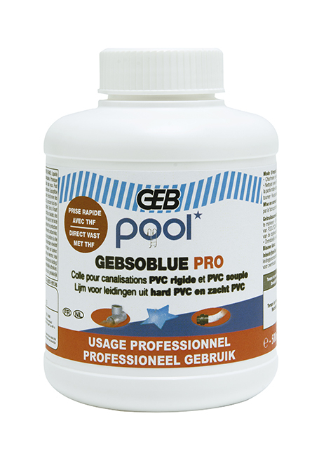 Colle PVC Pool Gebsoblue pro. Spécial piscine Geb. Colle pour assemblage d’éléments de canalisation en PVC souple (PVC flexible) et PVC rigide (U-PVC) utilisés dans l’univers de la piscine. Contient du THF. Collage de canalisations en PVC souple et de raccords en PVC rigide; Collage de canalisations en PVC rigide et de raccords en PVC rigide. Résiste aux produits de traitement des eaux de piscine, à l’eau salée, à l’eau de mer. Convient pour réseaux d’adduction et d’évacuation d’eau des piscines. Utilisable sous pression pour les diamètres inférieurs à 100 mm