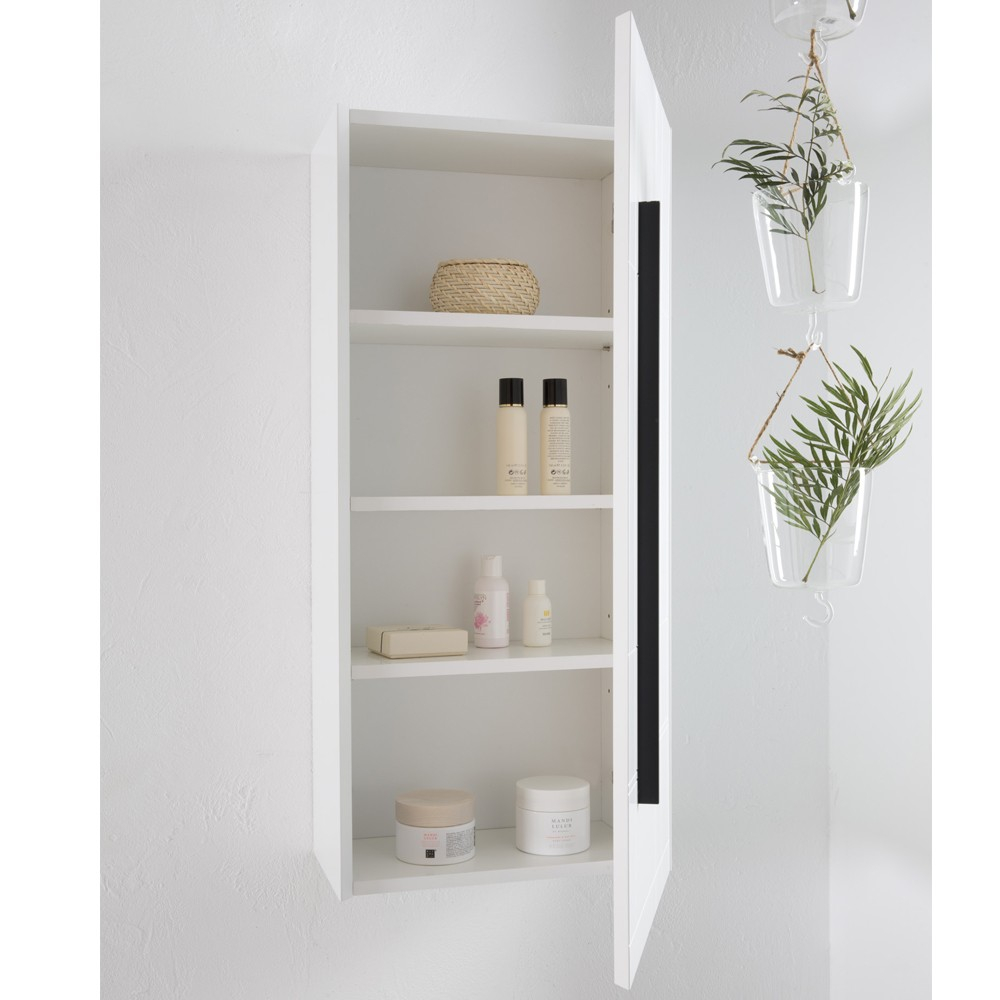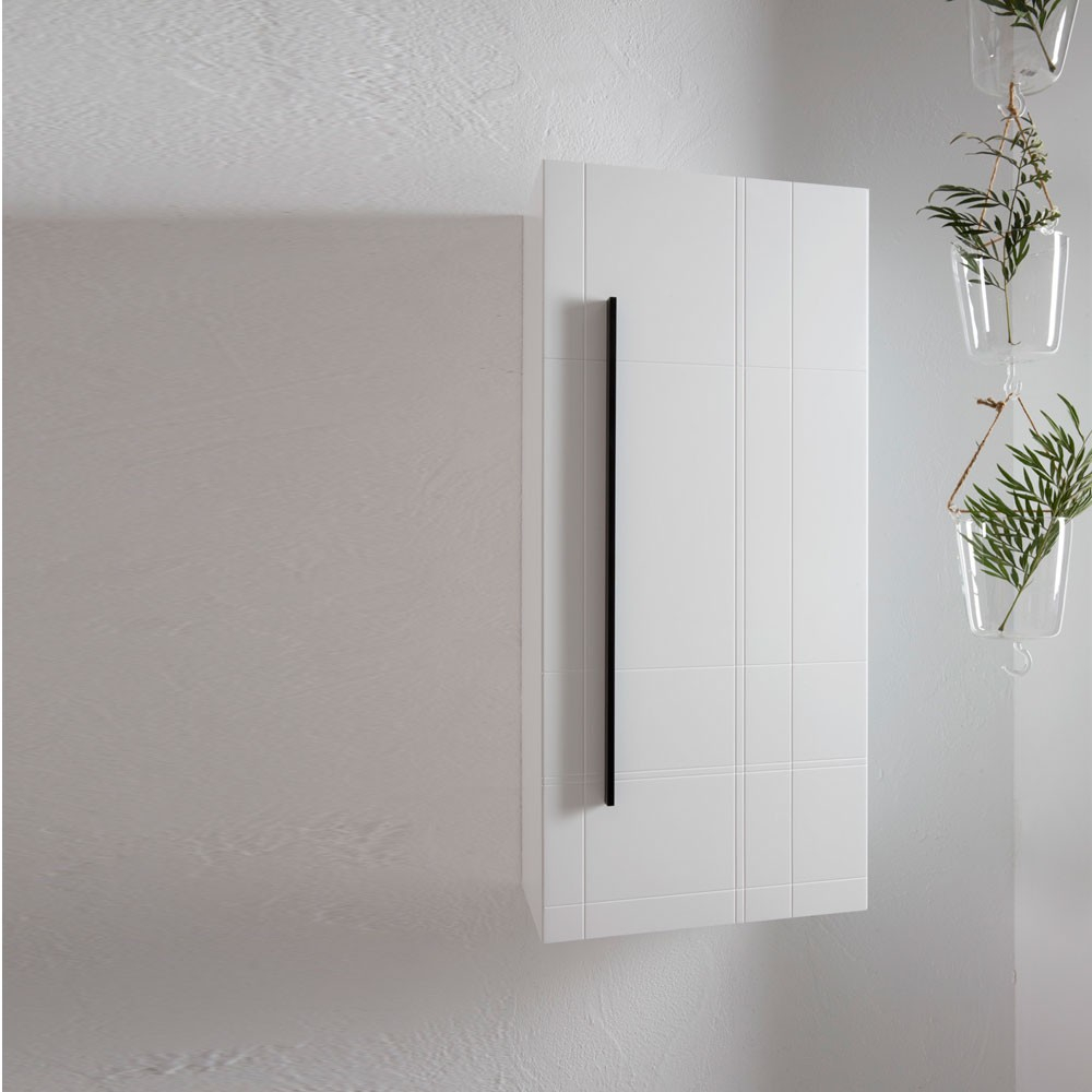Colonne de salle de bain réversible. Corps et façade en MDF - ép. 16 mm. Fermeture progressive 1 porte, 4 étagères. Poignées apparentes métalliques laquées noires. Finition extérieure laqué mat 5 teintes