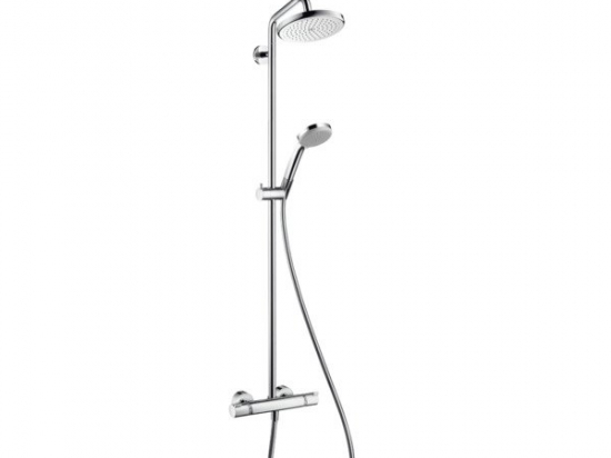 Caractéristiques · comprenant : douche de tête, douchette, thermostatique de douche, flexible de douche, curseur, barre de douche · douche de tête Croma 220 · taille de la douche de tête: 220 mm · type de jet douche de tête : jet RainAir · rotule: douche de tête orientable · type de jet douchette: jet Rain, jet massage, jet shampooing, jet normal · débit maximal sous 3 bars de pression: 15 l/min · tube recoupable par le bas · diamètre de la barre de douche: 22 mm · support de douchette réglage en hauteur · longeur du bras de douche: 400 mm · bras de douche pivotant · thermostatique Ecostat Comfort · butée de confort à 40° C · limiteur d’eau chaude réglable · on peut utiliser seulement 1 système/sortie à la fois · entraxe 150 mm ± 12 mm · tube recoupable par le bas · ACS 18 ACC LY 292, valide jusqu'au 17.05.2023
