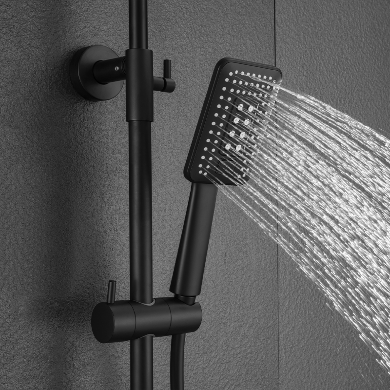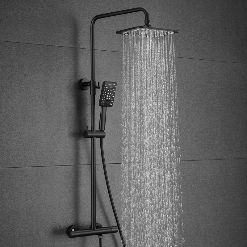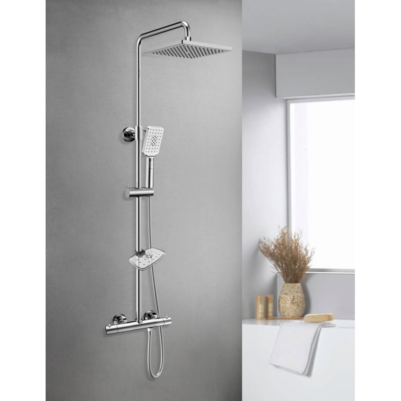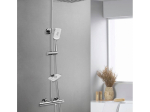 Barre réglable en hauteur. Pommeau de douche pluie carré en ABS. Douchette à main 3 jets en ABS. Picots anti-calcaire. Porte savon ABS sur coulisseau. Mitigeur thermostatique avec inverseur intégré. Flexible de douche 1,50 m double agrafage. Pour plus de détails, consulter les fiches techniques des modèles dans l'onglet "Médias"