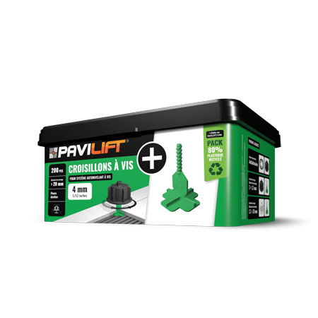 Les croisillons en "+" pour largeur de joints de 2 mm à 4 mm, sont destinés aux Poses Droite / en Diagonale / Tapis / en Croix / en Opus Romain, s'associent aux cadrans rotatifs Pavilift, noirs ou blancs selon l'épaisseur de vos carreaux.