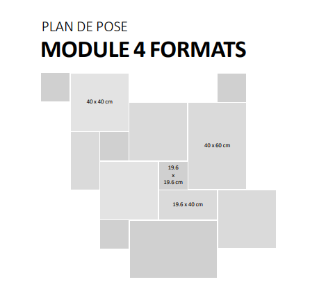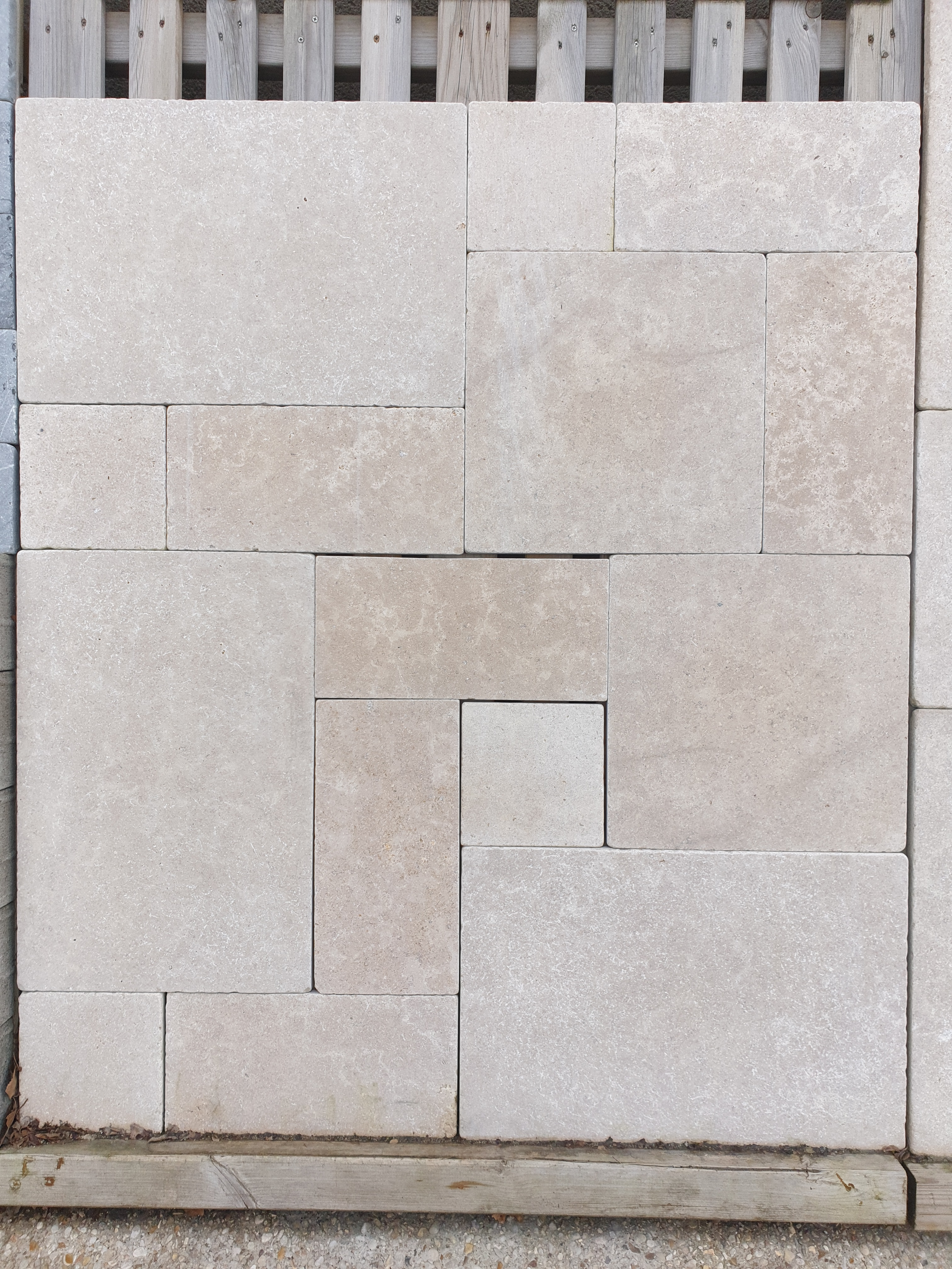 Livré en 4 formats panachés: 40X40 cm / 40X60 cm / 19.6X19.6 cm / 19.6X40 cm | Pierre naturelle beige très dure et non gélive. Non immergeable