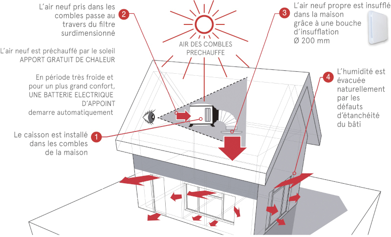 Air neuf automatiquement réchauffé si nécessaire | Air neuf mélangé par introduction d'air extérieur | Adaptation électronique / configuration maison