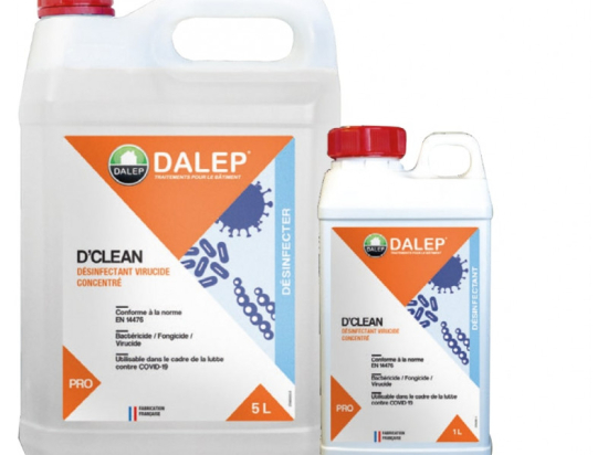 Désinfectant virucide concentré Dclean de marque Dalep. Désinfecte les sols et surfaces lavables de tous locaux Idéal contre les bactéries, les virus, les moisissures et les champignons Application par pulvérisation, essuyage ou trempage Conforme à la norme EN 14476 TP2. Désinfectant pour les surfaces, matériaux équipements et mobilier sans contact direct avec les denrées alimentaires ou les aliments pour animaux. TP4. Désinfectant pour les surfaces en contact avec les denrées alimentaires. Avant toute utilisation, assurez-vous que celle-ci est indispensable, notamment dans les lieux fréquentés par le grand public. Privilégiez chaque fois que possible les méthodes alternatives et les produits présentant le risque le plus faible pour la santé humaine et animale et pour l’environnement. Produit dangereux. Respecter les précautions d’emploi. Avant toute utilisation, lisez l’étiquette et les informations concernant le produit.