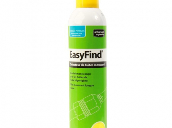 Détecteur de fuites EasyFindTM. Produit moussant spécialement conçu pour détecter les fuites de fluide frigorigène. Les détecteurs de fuites de gaz ne conviennent pas aux fluides frigorigènes, car ils n’ont pas la même viscosité et donc n’adhèrent pas bien aux surfaces. Ils se décollent trop vite de la tuyauterie et ne donnent pas le temps de repérer la fuite.