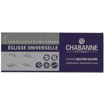 Eclisse universelle clipsable pour murs et plafonds. Marque: Chabanne. Mise en place sur tous types de fourrures en clipsant par le dessus des fourrures. Permet la création d'entourage de fenêtre. L'éclisse universelle de Chabanne en acier galvanisé permet d'assurer la liaison entre 2 fourrures bout à bout, perpendiculaire, parallèle ou angulaire (habillage des sous rampants).
