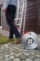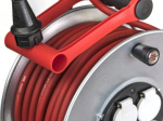 Enrouleur électrique compact doté de 4 prises de courant électrique avec clapets bleus à fermeture automatique, disjoncteur thermique et un voyant de présence de tension LED - Fabriqué en France. Enrouleur de câble conçu pour une utilisation en extérieur, équipé de 25m de câble H07RN-F 3G2,5 - puissance maxi : câble non déroulé 1000W - câble déroulé 3500W. Enrouleur compact avec indice de protection IP44 - protégé contre la pénétration de corps solides de 1mm de diamètre et les projections d'eau - clip de fixation du câble et frein de tambour. Dérouleur de câble muni d'une poignée de transport cablepilot (conçu pour gaucher et droitier) avec un guidage parfait du câble, bascule de chaque côté pour un transport et une accroche facile. Dévidoir électrique résistant aux chocs grâce au support et aux flasques en acier galvanisé, au moyeu en matière isolante renforcé et bouton tournant pour un enroulement facile du câble