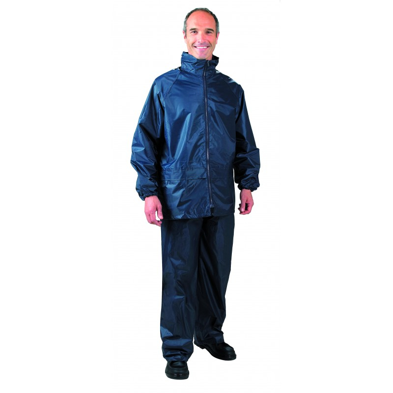 Ensemble de pluie bleu marine en PVC et polyester de 170gr, avec 2 poches, une fermeture par zip et rabat boutons-pression. La capuche est intégrée dans le col et les poignets sont coupe-vent. Le pantalon a un élastique de serrage à la taille. Plusieurs tailles disponibles !