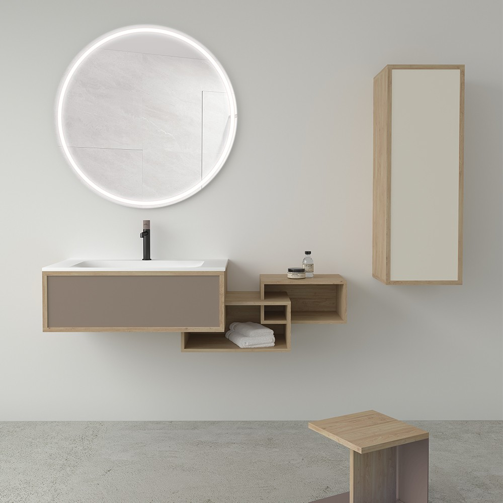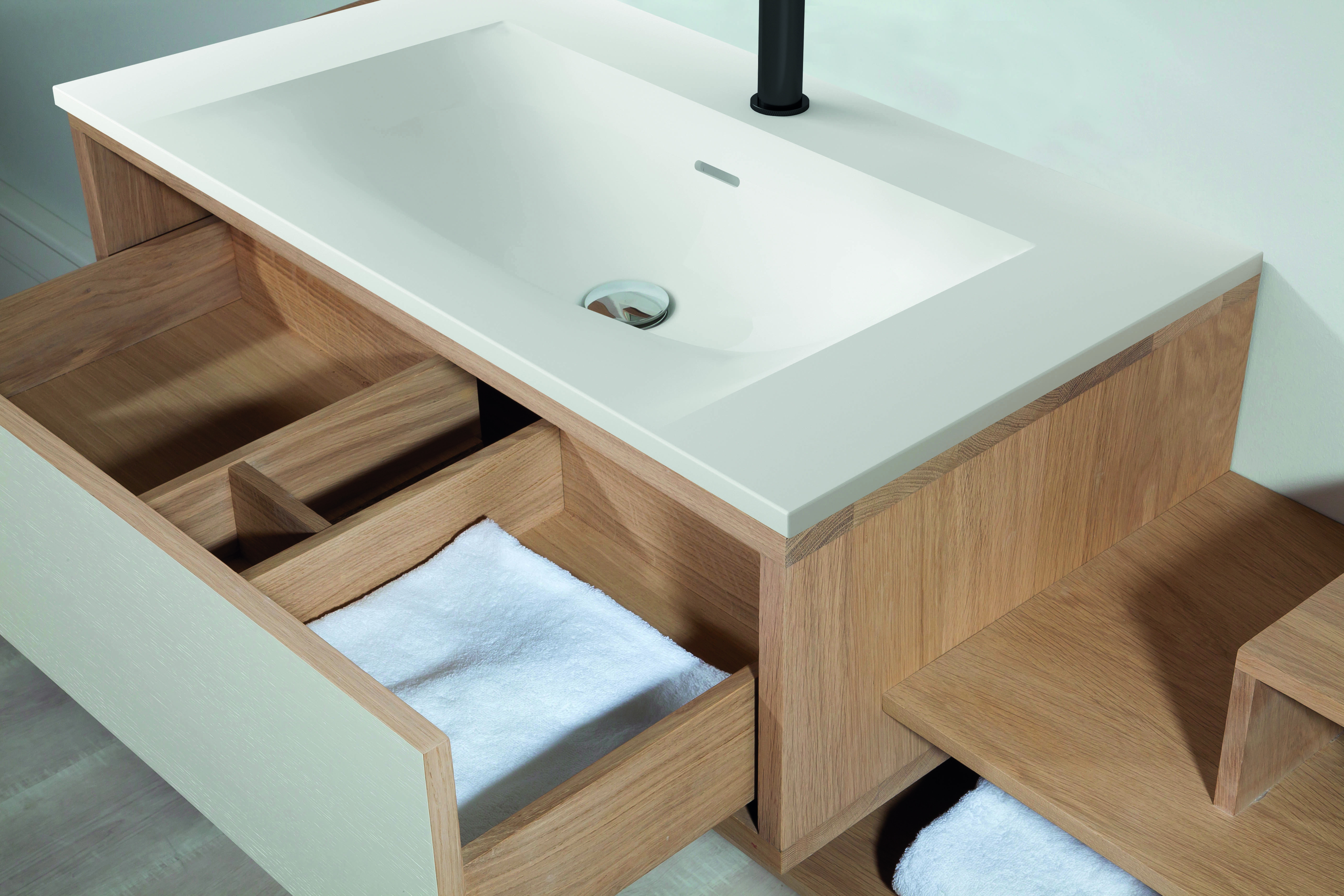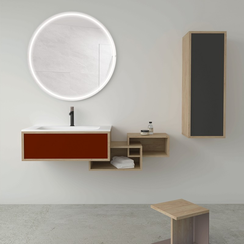 Ensemble de meuble de salle de bain SCALA 135 cm. Iconique, la collection SCALA se réinvente en intégrant un plan vasque encastré et en dissociant sa colonne. Un modèle aérien, tout en finesse, doté d'une identité très forte à l'image de ses créateurs. Le processus de fabrication est assuré par des maîtres artisans ébénistes qui révèlent l'âme du bois. Meuble sous vasque avec 1 tiroir et 2 espaces ouverts Tiroir coulissant équipé de glissières SALICE avec fermeture progressive SOFT CLOSE - Ouverture PUSH. Corps et façade en chêne massif certifié PEFC 4 finitions laquées sur les façades anthracite, ivoire, lin et rouge Livré sans vidage. Colonne réversible Fermeture progressive SOFT CLOSE - Ouverture PUSH Corps et façade en chêne massif certifié PEFC 1 porte et 3 étagères