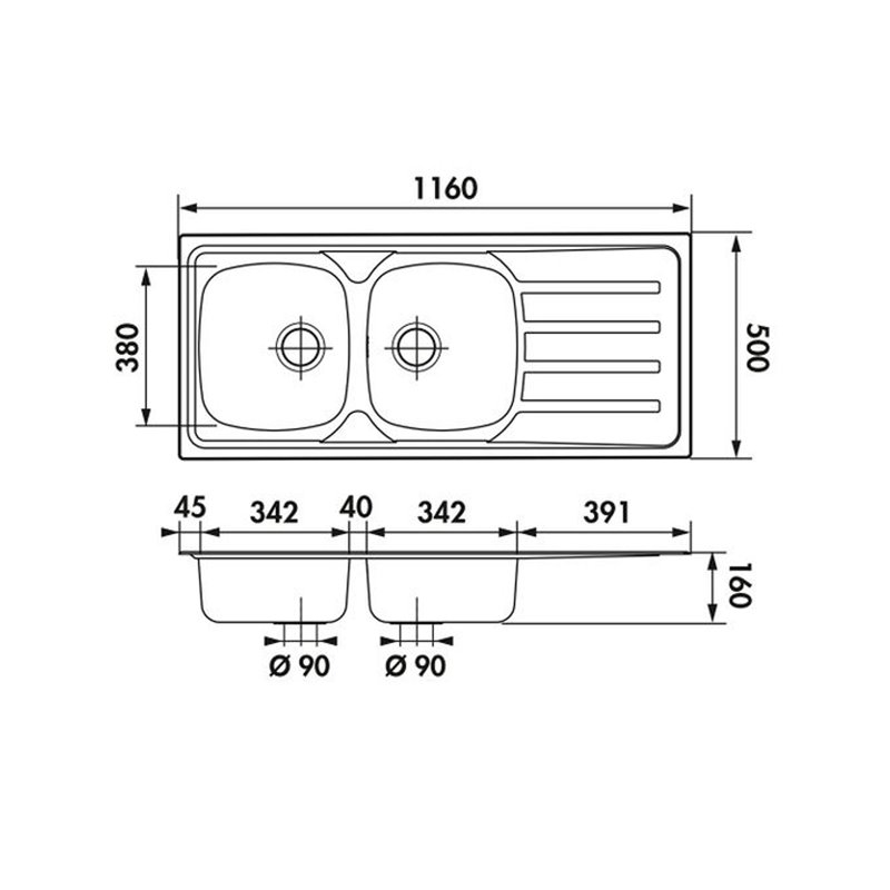 Evier en Inox avec 2 bacs et 1 égouttoir | L1160 x l500 x P160