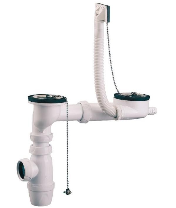 Ce kit permet d'équiper complètement un évier 2 cuves de diamètre 50 mm. Le trop plein est incorporé. Il contient également deux bondes et un siphon réglable en hauteur et prise pour machine à laver. L'entraxe est également réglable. Cela permet de s'ajuster à toutes les configurations d'évier. L'équipement comprend également des bouchons-chaînettes pour un vidage manuel et des cuvettes en inox de diamètre 40 mm. Le serrage peut se faire de 0 à 10 mm. Le corps est en plastique blanc. Les finitions apparentes sont en inox. Extra plat, ce kit permet un véritable gain de place. Le pose est très rapide et l'installation est facile. Débit 55l/mn. Ce kit est certifié par la norme NF pour sa qualité.