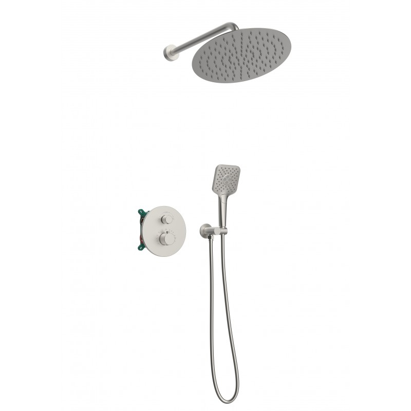 Le kit inclut un pommeau rond en inox, un bras mural, un mitigeur thermostatique encastré, une douchette à main ABS avec support, et un flexible — ensemble prêt à poser.