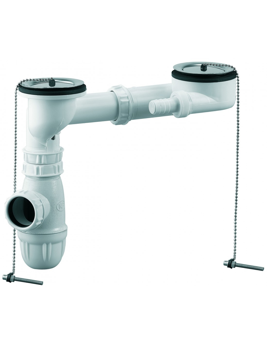 Ce kit équipe un évier 2 cuves avec trop plein incorporé. Grâce à son entraxe ajustable de 156 à 260 mm et à son siphon réglable de 62 à 97 mm, cet équipement s'adapte à toutes les configurations. La hauteur sous évier varie ainsi de 247 à 282 mm. La sortie du siphon a la taille standard de 40 mm. Le kit comprend une prise pour machine à laver. Débit 56l/mn Les cuvettes en inox mesurent 85 mm de diamètre. Les bouchons sont avec enjoliveurs reliés par des chaînettes de 300 mm et des bornes d'attache. Ce kit est certifié NF. Equipement extra plat, gain de place. Montage et installation rapide et facile.