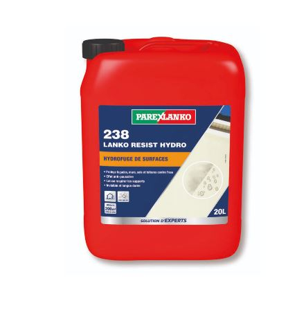 Bidon de 5 L - 238 LANKO RESIST HYDRO est un hydrofuge de surface en phase aqueuse à base de silanes et siloxanes prêt à l’emploi de PAREX LANKO. Il migre par capillarité et se fixe durablement dans le support. Il ne modifie pas l’aspect initial des supports.