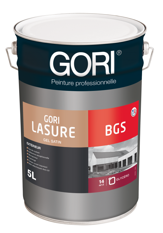 Lasure bois gélifiée BGS de marque Gori. Pas de coulure Adhérence exceptionnelle Microporeux Hydrofuge Temps ouvert important Effet réfléchissant Anti-UV