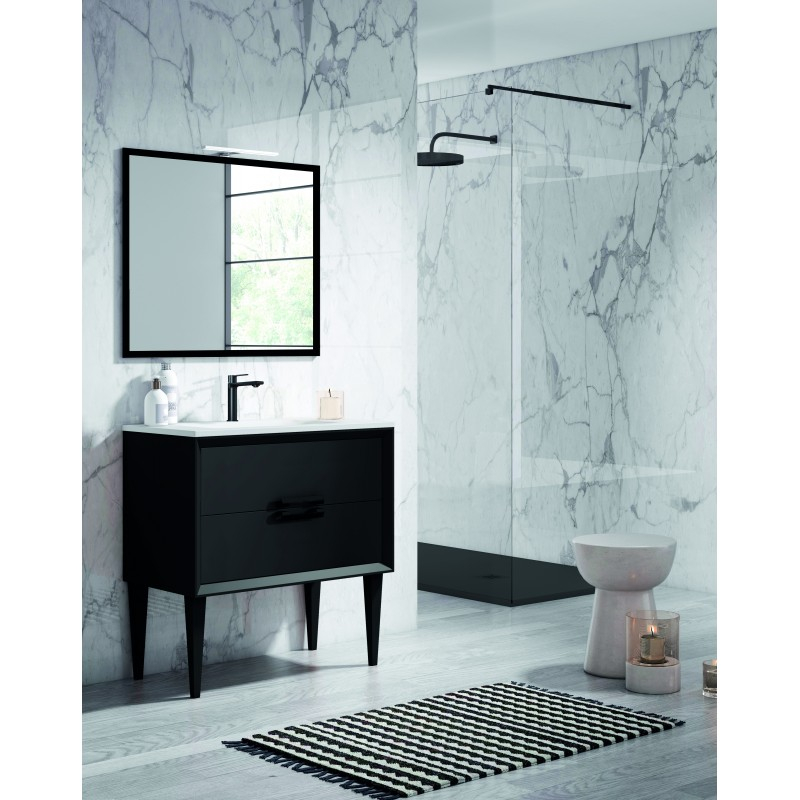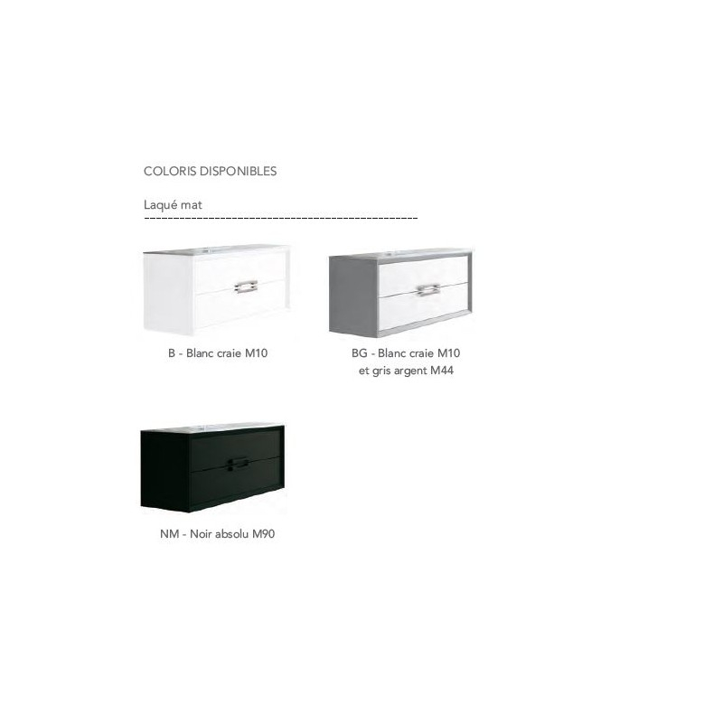 Meuble de salle de bain à suspendre ou à poser AMANDE, disponible en simple vasque L600 - L800 - L1000 mm et en double vasque L1200 mm (2 meubles de 600 mm). Meuble sous vasque avec 2 tiroirs | Corps et façade en MDF (panneaux de fibres à densité moyenne) - ép. 18 mm | 2 tiroirs coulissants métalliques HETTICH avec fermeture progressive | Ouverture totale avec poignées en aluminium finition chromée (meuble blanc, blanc et gris argent) ou laqué (meuble noir absolu) | Finition extérieure en laqué mat, 3 coloris (blanc craie, blanc craie et gris argent, noir absolu) |Livré sans vidage Une collection élégante au charme authentique. Sur les tiroirs de fines poignées en métal laqué dupliquent l’effet d'encadrement des façades.En version à suspendre ou à poser en ajoutant des pieds laqués blancs ou noirs selon la couleur du modèle.
