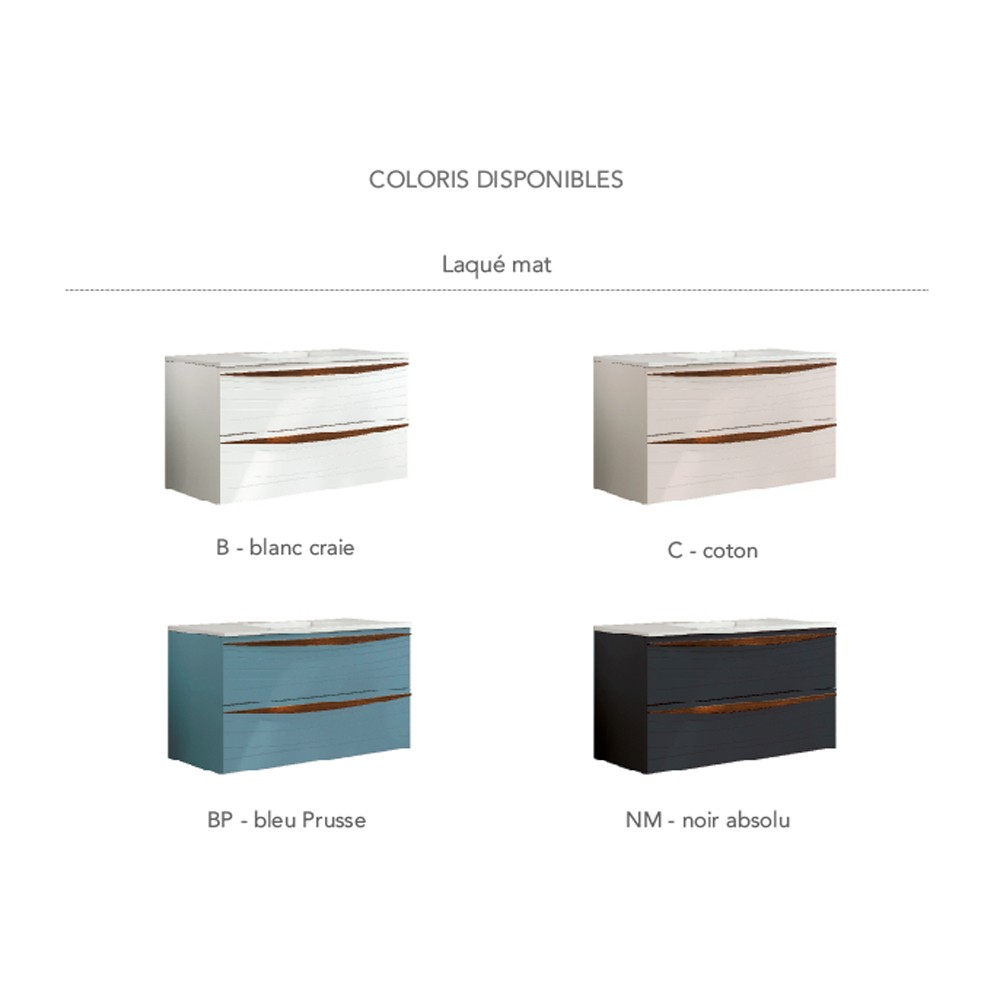 Les poignées majestueuses en noyer massif s'intègrent sur toute la largeur du modèle. En écho, les lignes courbes gravées sur les façades suivent le même mouvement. Proposé en 3 dimensions (autres dimensions 100 cm et 120 cm sur demande) et 4 couleurs en finition laqué mat: noir absolu, blanc craie, coton et bleu Prusse.