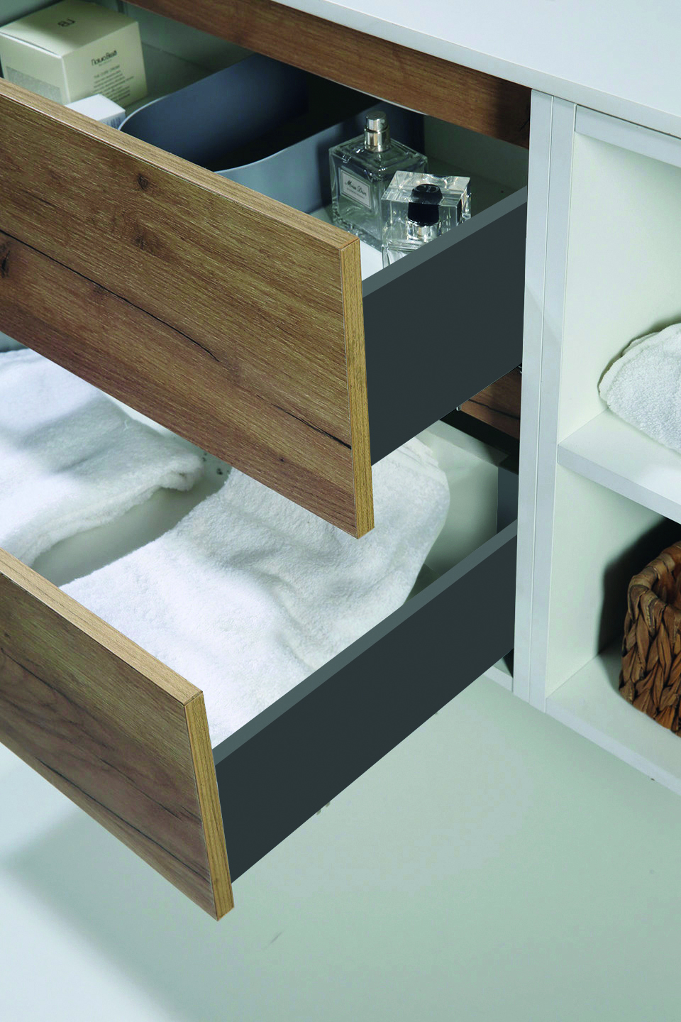 - Tiroirs coulissants métalliques, fermeture progressive.