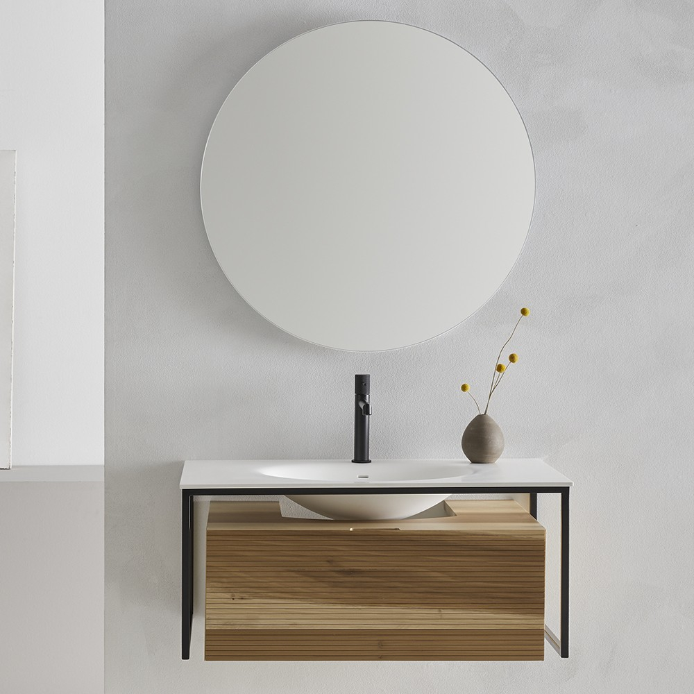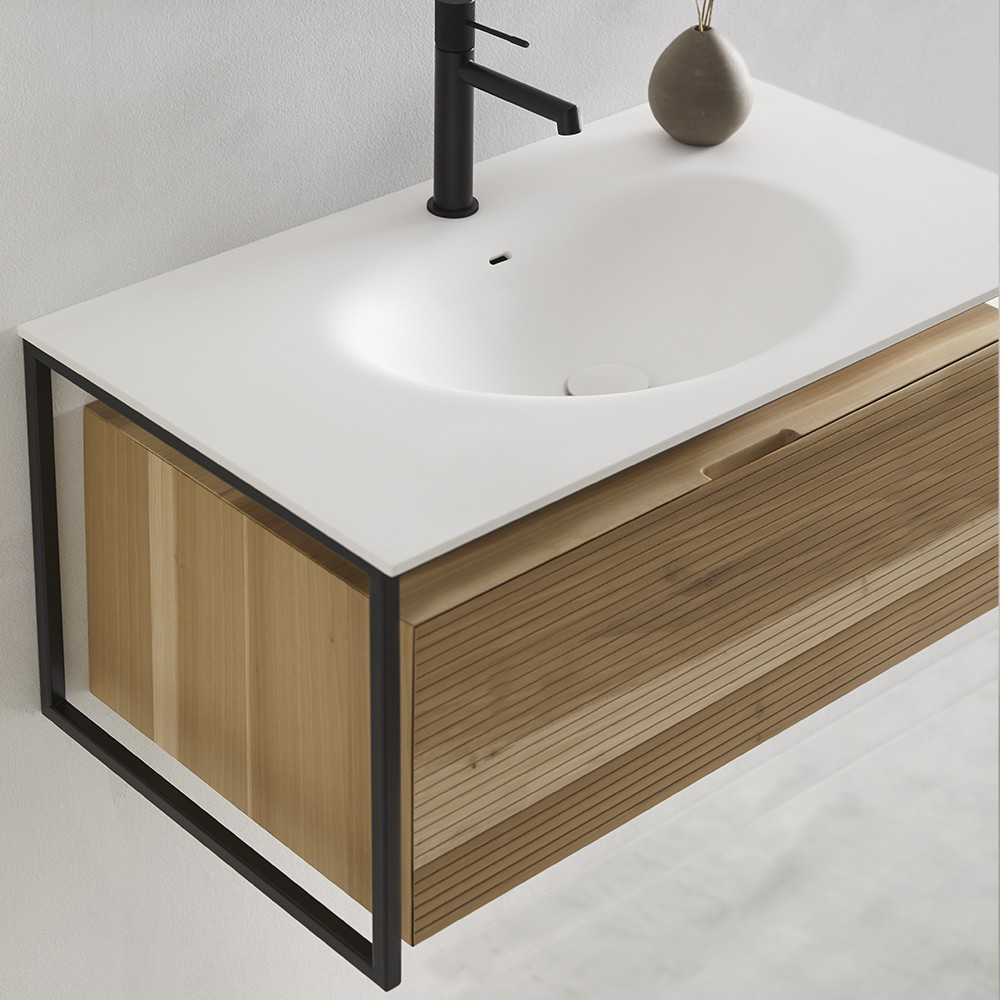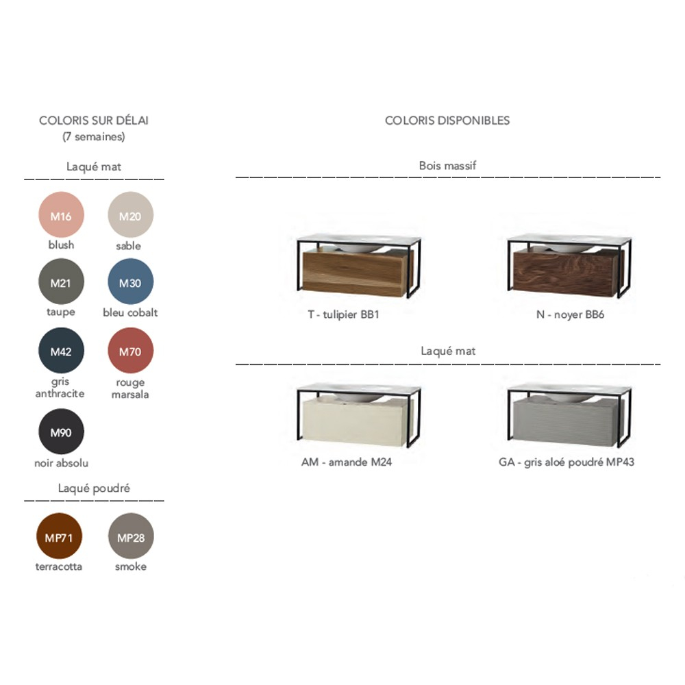 Ensemble meuble et vasque FARGO 80 cm. Un jeu de matières souligné par une structure en métal laqué noir. Chaque détail est soigné, plan vasque en Solid surface affleurant le meuble, façade cannelée dotée d'une prise de main discrète, choix de finition unique. En bois massif aux reflets dorés pour le tulipier, tons chocolats pour le noyer ou en version laquée dans les coloris tendances 2022, amande ou gris aloé poudré. Meuble sous vasque 1 tiroir L800 mm avec plan vasque centré ou L1300 mm avec simple vasque décentrée à gauche Un tiroir coulissant métallique GRASS avec fermeture progressive SOFT CLOSE Ouverture totale Façade cannelée, joues lisses Structure en métal laqué noir Finition laquée : - corps et joues en MFC (panneaux de bois aggloméré et mélaminé) - ép. 16 mm - façades en MDF (panneaux de fibres à densité moyenne) certifiés PEFC - ép. 16 mm - finition extérieure laqué mat amande ou gris aloé poudré Finition en bois massif : - corps et façade tulipier massif - ép. 21 mm - corps et façade noyer massif - ép. 21 mm Livré sans vidage Plan vasque Plan vasque FARGO en Solid-surface L800 - L1300 mm Colonne Colonne réversible L400 x 400 mm 1 porte - 1 étagère Finition laquée : corps et joues en MFC - ép. 16 mm / façade en MDF - ép. 16 mm Finition bois massif : corps et façade enchêne ép. 21 mm ou noyer ép. 21 mm