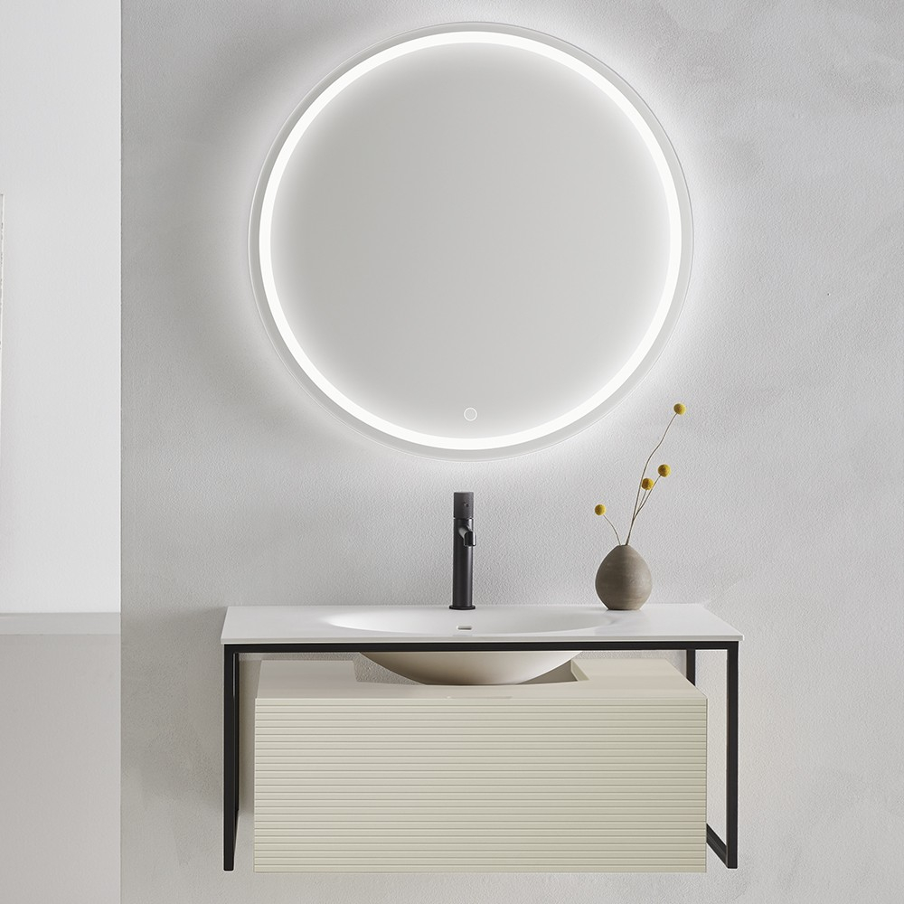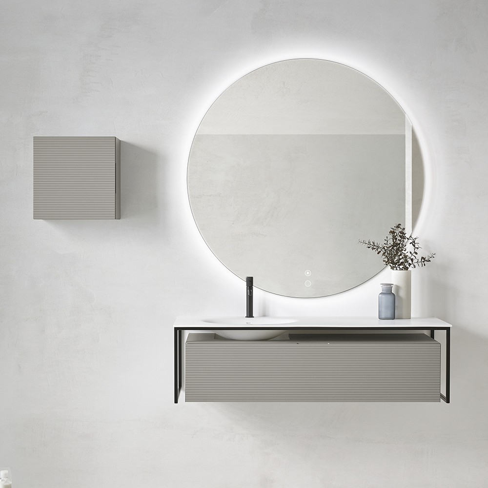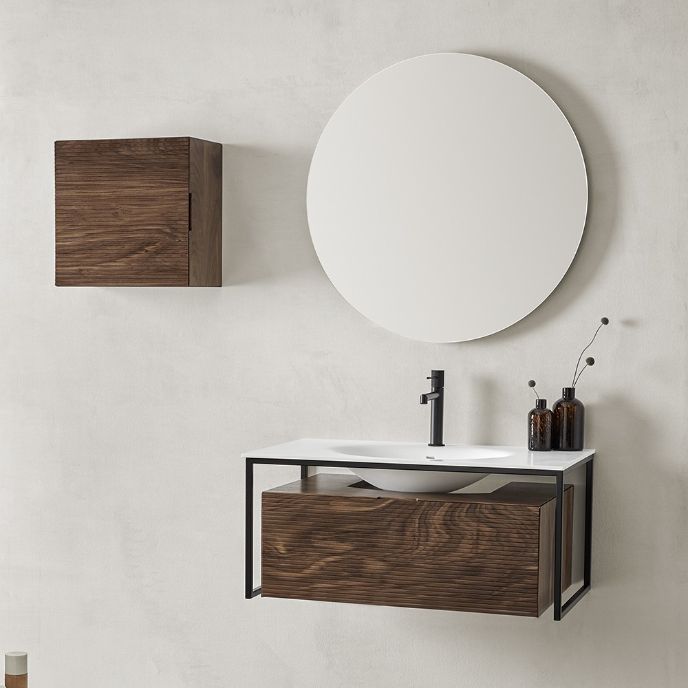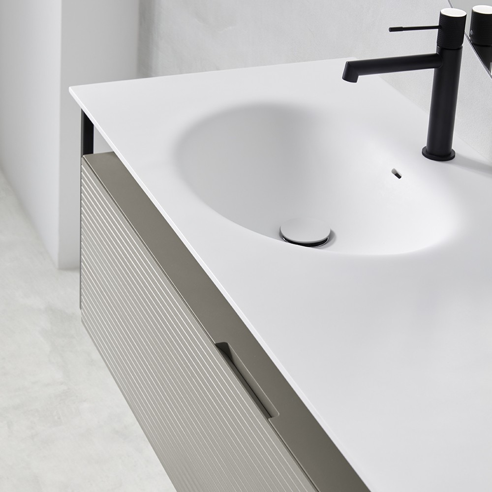 Ensemble meuble et vasque FARGO 80 cm. Un jeu de matières souligné par une structure en métal laqué noir. Chaque détail est soigné, plan vasque en Solid surface affleurant le meuble, façade cannelée dotée d'une prise de main discrète, choix de finition unique. En bois massif aux reflets dorés pour le tulipier, tons chocolats pour le noyer ou en version laquée dans les coloris tendances 2022, amande ou gris aloé poudré. Meuble sous vasque 1 tiroir L800 mm avec plan vasque centré ou L1300 mm avec simple vasque décentrée à gauche Un tiroir coulissant métallique GRASS avec fermeture progressive SOFT CLOSE Ouverture totale Façade cannelée, joues lisses Structure en métal laqué noir Finition laquée : - corps et joues en MFC (panneaux de bois aggloméré et mélaminé) - ép. 16 mm - façades en MDF (panneaux de fibres à densité moyenne) certifiés PEFC - ép. 16 mm - finition extérieure laqué mat amande ou gris aloé poudré Finition en bois massif : - corps et façade tulipier massif - ép. 21 mm - corps et façade noyer massif - ép. 21 mm Livré sans vidage Plan vasque Plan vasque FARGO en Solid-surface L800 - L1300 mm Colonne Colonne réversible L400 x 400 mm 1 porte - 1 étagère Finition laquée : corps et joues en MFC - ép. 16 mm / façade en MDF - ép. 16 mm Finition bois massif : corps et façade enchêne ép. 21 mm ou noyer ép. 21 mm