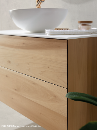 Un design aux lignes pures dessiné par une créatrice à la recherche du sens réel des choses. Arrêtes biseautées en finition affleurante, ouverture sans poignées, système push. La collection FUJI est déclinée en plusieurs dimensions et finitions, bois massifs ou laques. Les configurations les plus exigeantes bénéficient de l'offre sur-mesure. Meuble à suspendre 1 tiroir en L1000 et 2 tiroirs en L800, L1000, L1200 et 1400 mm 2 tiroirs coulissants métalliques GRASS avec fermeture progressive SOFT CLOSE | Ouverture PUSH | Finition laquée : - corps et joues en MFC (panneaux de bois aggloméré et mélaminé) - ép. 16 mm - façades en MDF (panneaux de fibres à densité moyenne) - ép. 16 mm - finition extérieure laqué mat blanc craie, amande, noir absolu, smoke poudré | Finition bois massif : - corps et joues en chêne massif - ép. 21 mm | Livré sans vidage | Module à suspendre 1 tiroir en 800 mm | Tiroir coulissant métallique GRASS avec fermeture progressive SOFT CLOSE | Laqué : corps et joues en MFC - ép. 16 mm - Façade en MDF - ép. 16 mm | Bois massif : corps et joues en chêne - ép 21 mm | Colonne Réversible - 1 porte 1 étagère | Laqué : corps et joues en MFC - ép. 16 mm - Façade en MDF - ép. 16 mm Bois massif : corps et joues en chêne - ép 21 mm