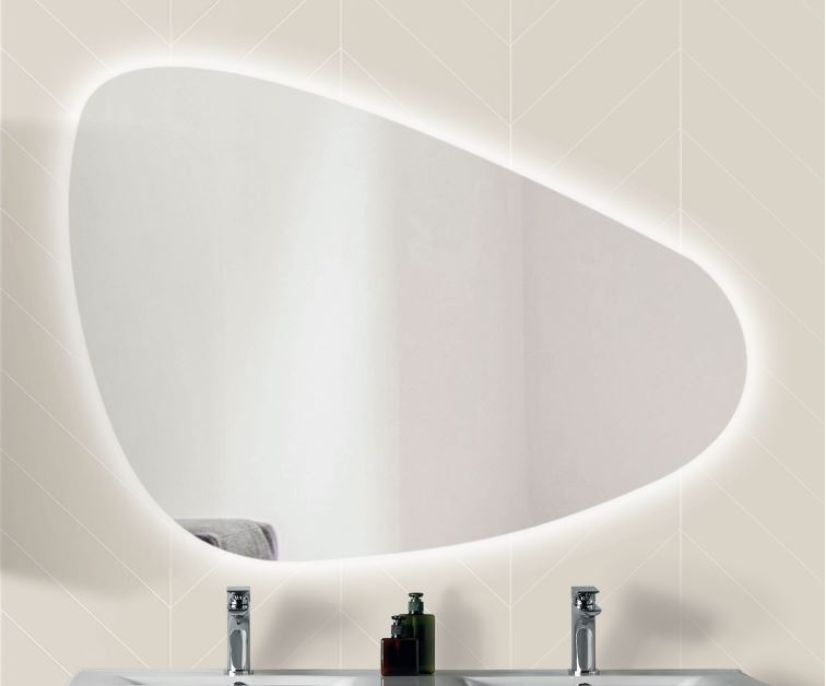 Miroir LED Galet Ottofond pour salle de bain. Forme organique moderne, éclairage périmétrique. Interrupteur tactile et fonction anti-buée. Design épuré.