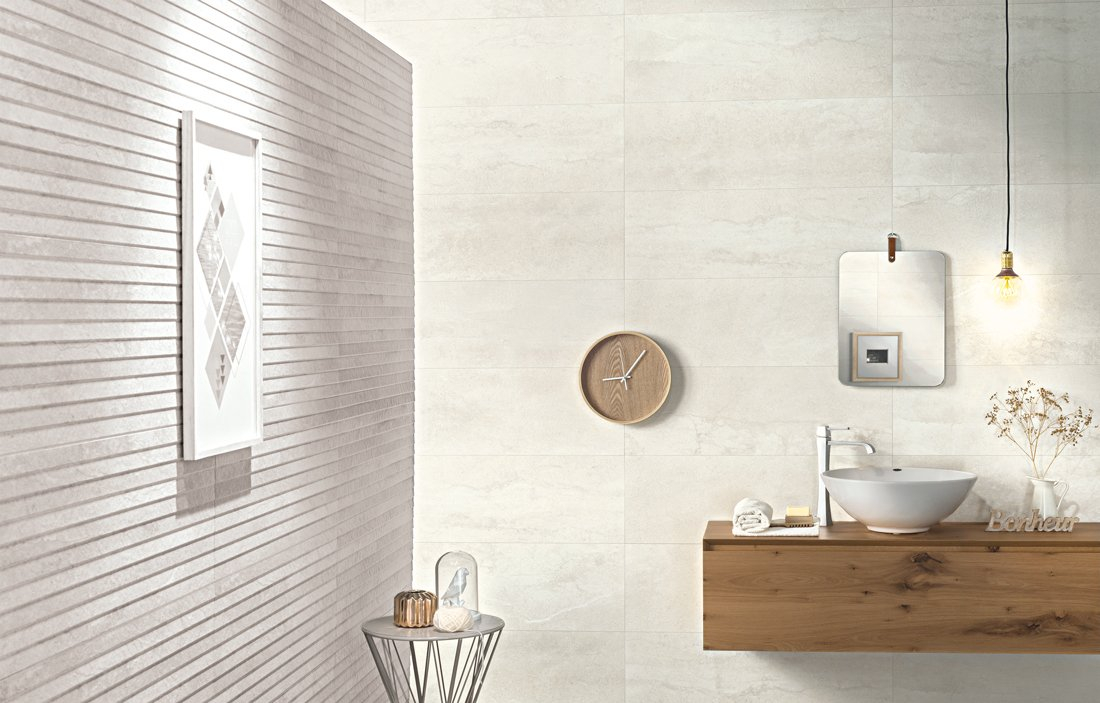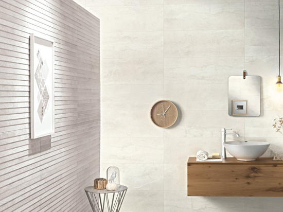 Carrelage mural Moonwalk 30x90. Nous vous proposons de découvrir la faïence de la série MoonWalk. Ce carrelage aspect pierre de grand format apporte un effet contemporain tout en utilisant le visuel d'un matériau traditionnel. Il habille aisément les murs de toutes les pièces de la maison et particulièrement ceux de la salle de bain. La régularité de sa surface lisse peut être rompue avec les carreaux à motif de la même gamme, qui sauront apporter une touche d'originalité à votre pièce.