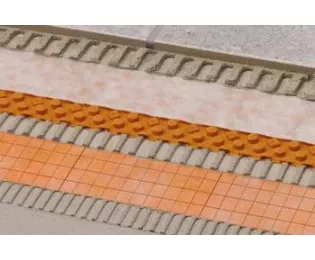 - Au niveau des joints de fractionnement du support, couper la natte Kerdi et recouvrir les jonctions avec la bande Kerdi Flex. Celle-ci peut égelement être utilisée en périphérie, pour les liaisons sol/murs. Une autre solution coniste à utiliser Kerdi-keba en formant une boucle appropriée.