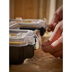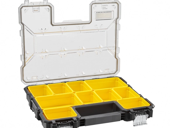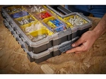 Couvercle en polycarbonate incassable avec encoches pour le maintien des compartiments Larges fermoirs métalliques Charge maximale : 5.5 kg Capacité : 7.5 litres Joint d’étanchéité sous le couvercle Attaches latérales permettant d'assembler plusieurs organiseurs: accroît la capacité de stockage
