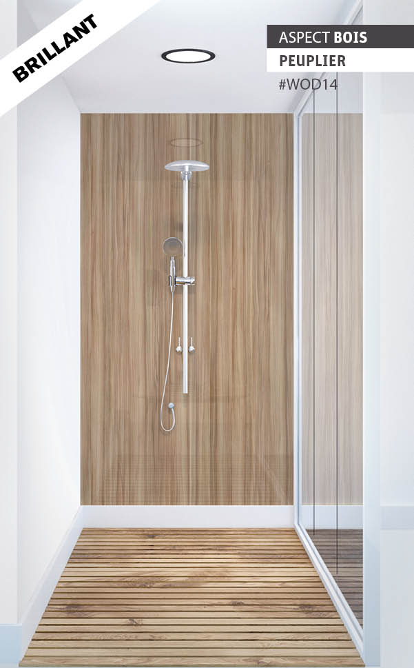 Panneau mural aspect bois peuplier brillant Vipanel de Roth. Panneau étanche en alu-composite finition de surface brillante Habillage d'une douche, une baignoire ou meme une salle de bain complète Aussi brillant que du verre Léger, résistant et durable Esthétique et innovant Installation en neuf ou en rénovation (directement en recouvrement de carrelage) Rénovation sans lourds et long travaux Recoupable pour s'adapter à toutes les dimensions Pose par collage avec ou sans profilé Attention pour la pose bord à bord, commander la bande métallique de jonction et aimant pour le montage