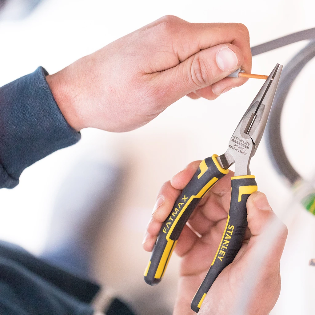 Pince à becs 1/2 ronds longs , marque Stanley. Fabriqué en acier trempé de haute qualité | Traitement à l'acier chromé forgé pour une meilleure longévité | Finition laquée | Poignée bimatière Fatmax | Conforme aux normes DIN 5745 et NF E 73-102