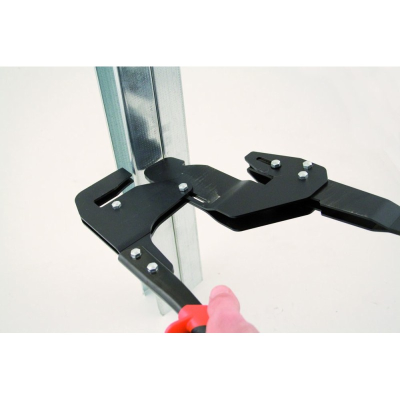 Pince à sertir les montants dos à dos Duo profil. Marque Edma. Spécial sertissage montants dos à dos (recommandé pour une hauteur de plafond supérieure à 2,50 m). Sertissage classique des rails et montants possible à partir de 90 mm de largeur. Capacité max. : 1 + 1 mm.