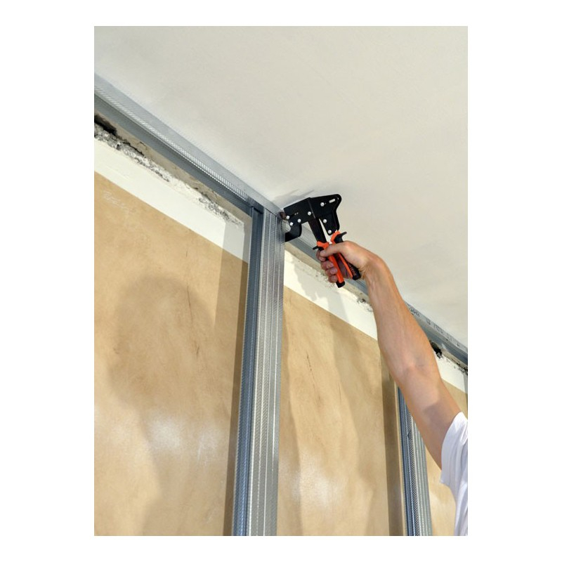 Ultra profil. Pince pour sertir tous types de rails et montants, lisses et fourrures F530. Utilisation à 1 main sans effort grâce à son système de crémaillère (3 crans pour que le poinçon arrive en contact sur le rail et 1 cran et demi pour sertir). Capacité max. : 1 + 1 mm. Poinçon breveté permettant une amélioration du sertissage de 60% et une réduction d'effort de 30%.