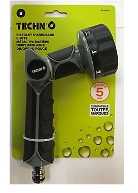 Pistolet d'arrosage pour le jardin et le nettoyage de l'extérieur | 8 jets | métal | Techn'o